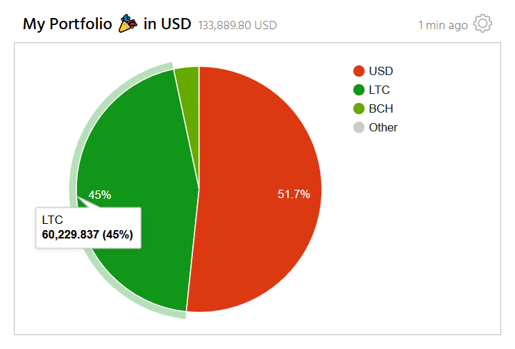 For example, the above chart shows a portfolio consisting of 52% USD, 45% LTC, and the remainder consisting of BCH and other currencies – if all balances were converted into USD today.