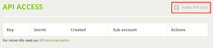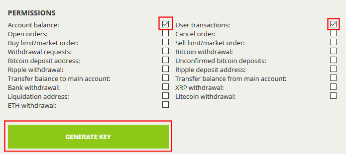 5. For the new API Key, make sure that only the "Account balance" and "User transactions" permissions are checked. Every other permission must not be checked. Click "Generate Key" to generate the new key.