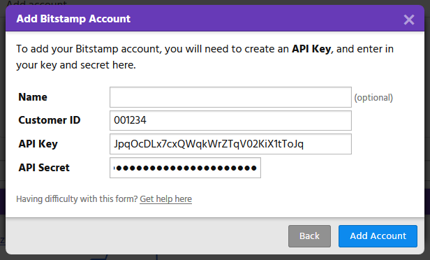 4. Click "Add Account". CryptFolio will now check your API key and download the balances and transactions from your Bitstamp account.