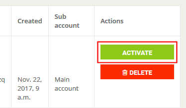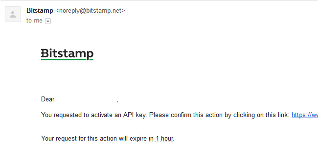 6. Your new key will need to be activated before it can be used. Click on the "Activate" button for Bitstamp to send you an email. If you do not activate your key within one hour, it will expire and you will need to start again.