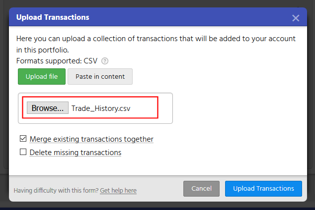5. Using the "Import transactions..." button, you can import each of the Cryptopia CSV files you saved previously, into your new account.
