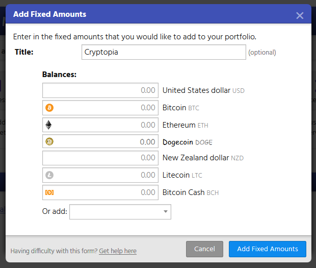 3. You can call the new account whatever you wish, for example "Cryptopia". You can leave all of the balances empty.