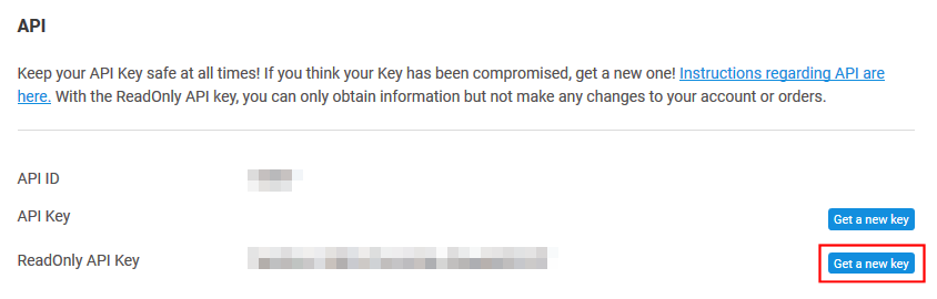 3. NiceHash only supports a single read-only API key per account. If you do not already have a read-only API key, create a new one by clicking Get a new key. Make sure that you only provide a read-only API key with CryptFolio.