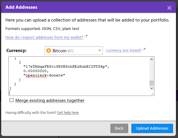 4. Click "Upload Addresses" to submit the file. CryptFolio will now process the file and add the addresses to your portfolio.