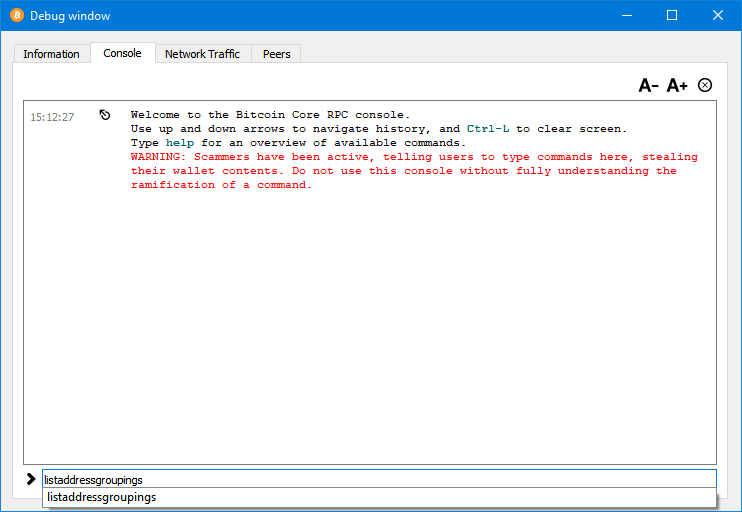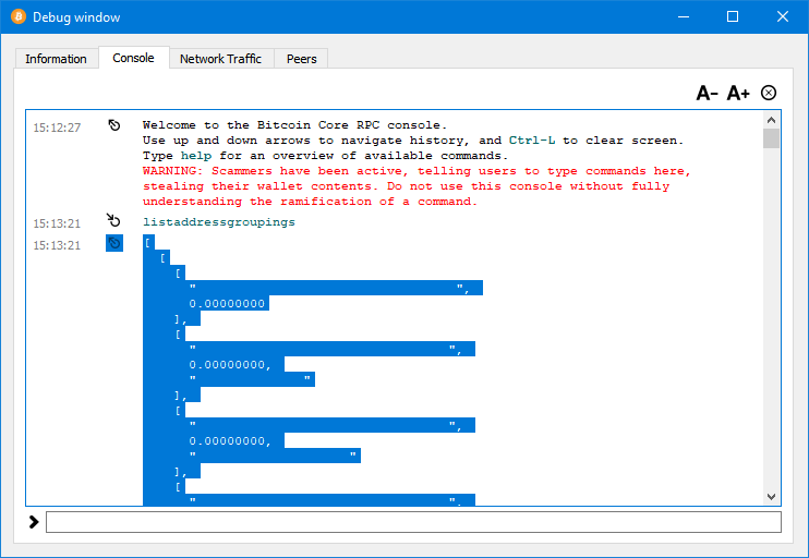 4. In the debug window, type in the command "listaddressgroupings", and press [Enter]. This will output a big text string (in the JSON format), listing all of your addresses, including received, change, and keypool addresses.
