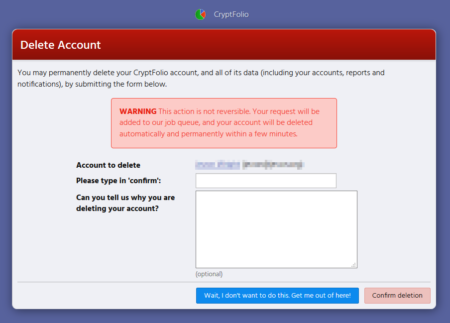 You will be shown a form to confirm that you wish to delete your account. You will need to type in "confirm" and click the big red button to confirm deletion. Deletion occurs automatically by one of our background workers, and you will receive a final email confirming that your account has been deleted.