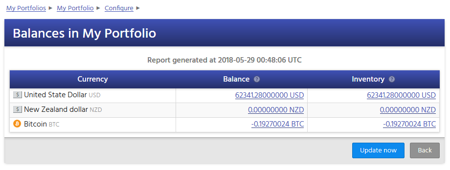 For each of the reporting currencies and non-zero currencies in your portfolio, CryptFolio calculates two values for the currency: your balance, and your inventory.