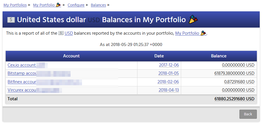 By clicking on the Balance link, you can view the Currency Balances report for your portfolio in that currency. This report breaks down the total balance by account, so you can see which accounts are contributing which balances to your total portfolio balance.