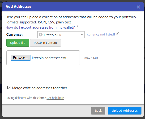 4. Click "Upload Addresses" to submit the file. CryptFolio will now process the file and add the addresses to your portfolio.