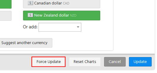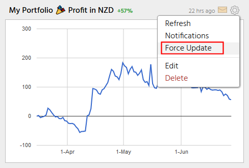 If, at any time, your portfolio charts appear to be out of date or incorrect, you can always force the portfolio to refresh your balances and histories, by clicking on the Force Update button when editing your portfolio:
