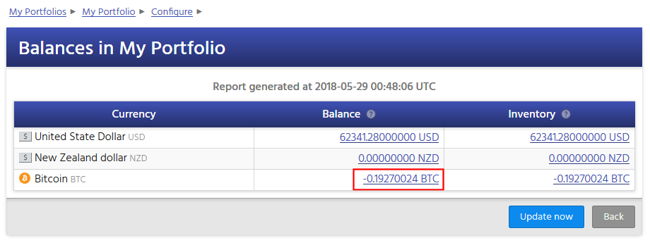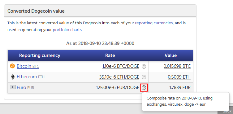 The balance report will include a converted value for this currency in each of your reporting currencies. These converted values are used to generate your charts and reports. The tooltip will demonstrate which exchanges were used, and on which dates, to calculate the converted value: