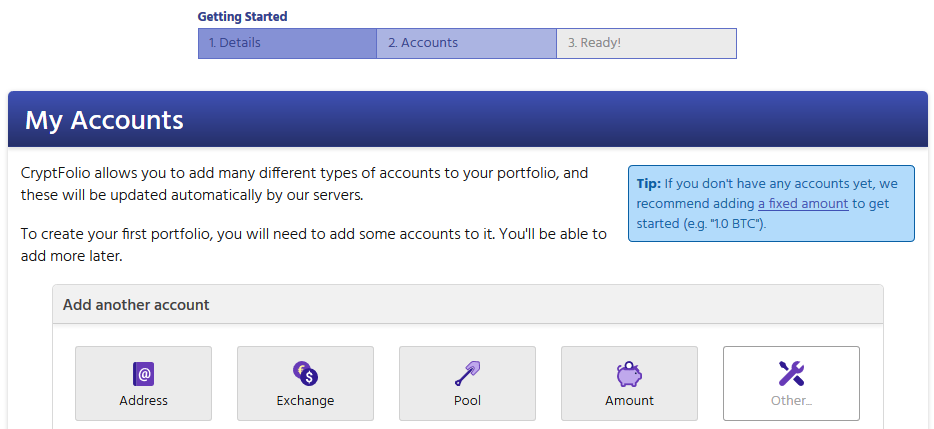 Rather than suggesting all users start by adding a fixed amount, and hiding the account/API functionality behind the Configure Portfolio interface, we now allow you to add addresses and accounts directly as part of the signup process: