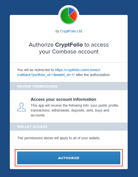 4. On Coinbase, authorise CryptFolio to access your account. Cryptfolio will now download the balances and transactions from your Coinbase wallets.